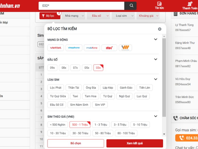 Sau đó trên thanh tìm kiếm bạn gõ 032*. Sau đó bạn chọn bộ lọc -> khoảng giá